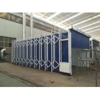 工作原理:移动伸缩前室由钢架结构和阻燃PVC布组成,通过平行四边形连杆机构或轨道驱动系统实现自动展开与合拢。工作时,前室沿轨道平滑移动至工件上方,形成封闭/半封闭空间进行喷漆;完成后收缩至一侧,节省空间并实现多工序共用场地。其核心系统包括: