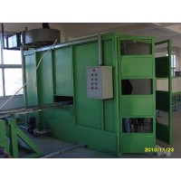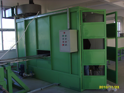 油帘喷漆室漆雾的处理采用油帘式结构,过喷的漆雾被油膜吸收落到室底油池中处理。油帘喷漆室的结构特点是房体正面方向内壁做成光滑的淌油板,用油泵将油打入淌油板顶部的油槽内溢流,在板面上形成瀑布状油帘。喷漆时,漆雾碰撞到油帘被油吸附冲至下部油槽中积存,这样室壁几乎不被污染。未碰撞到油帘的漆雾,经过抽风系统中的雾化喷嘴喷出的油雾进一步捕集吸附。喷漆室下部的循环油池装置由油池、漆油分离挡板、过滤网、供油泵、阀门管件,油池内的漆渣定期由人工打捞后集中存放处理。为保证室内空气清洁度,进风口设有空气过滤器,操作人员在室内进行工件喷漆操作。